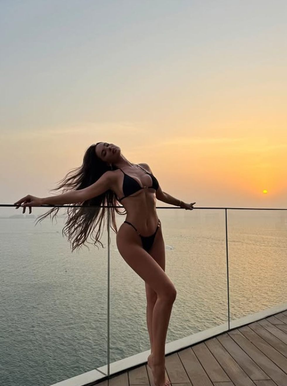 E veshur me bikini të zeza elegante, Oriola pozon në një ballkon luksoz me pamje të mrekullueshme, duke e theksuar siluetën e saj perfekte dhe stilin gjithmonë në qendër të vëmendjes.
