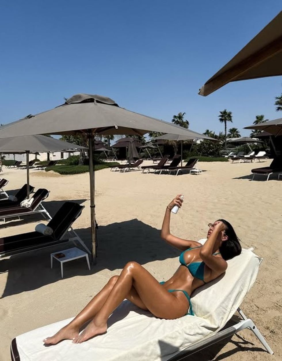 E veshur me një bikini ngjyrë të kaltër të ndezur, Oriola shfaqet duke shijuar diellin dhe rërën e artë, ndërsa relaksohet në një vend luksoz.