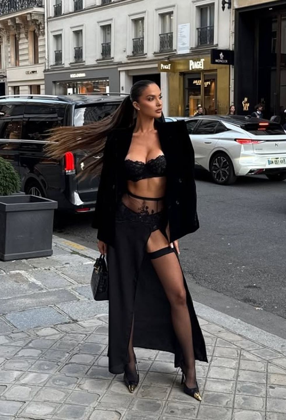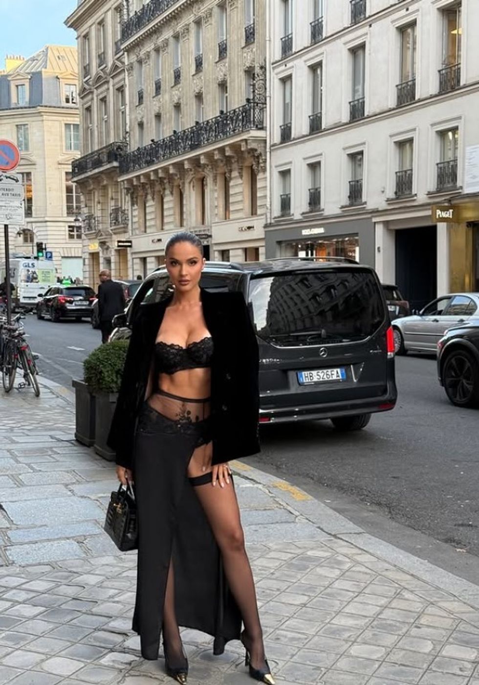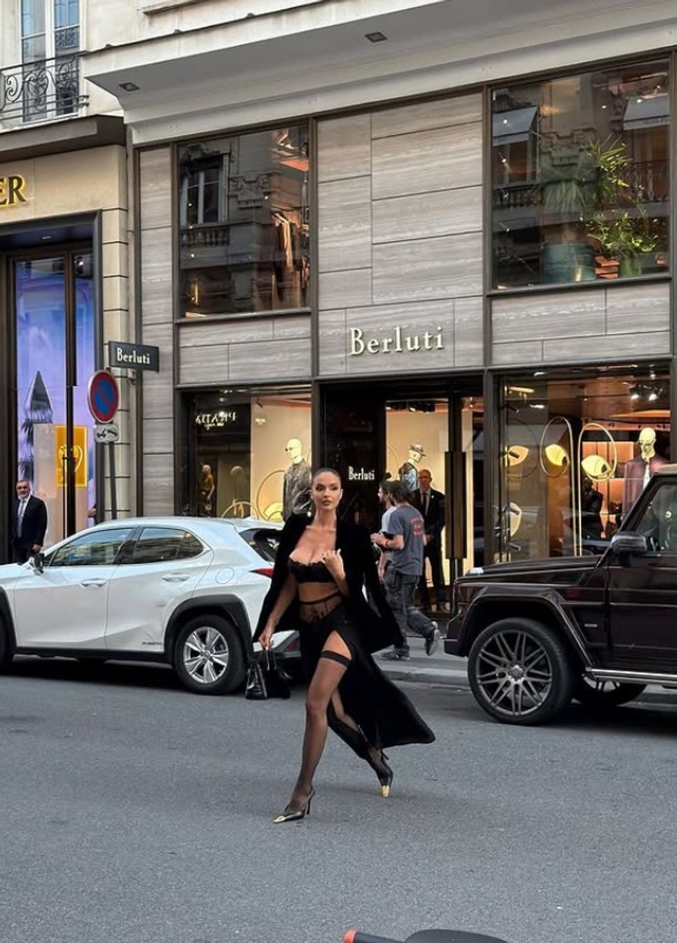 Pamja e saj e guximshme dhe sensuale, e realizuar në rrugët e Parisit, e ktheu setin në një moment mode që përkujton skenat e revistave të famshme të stilit.