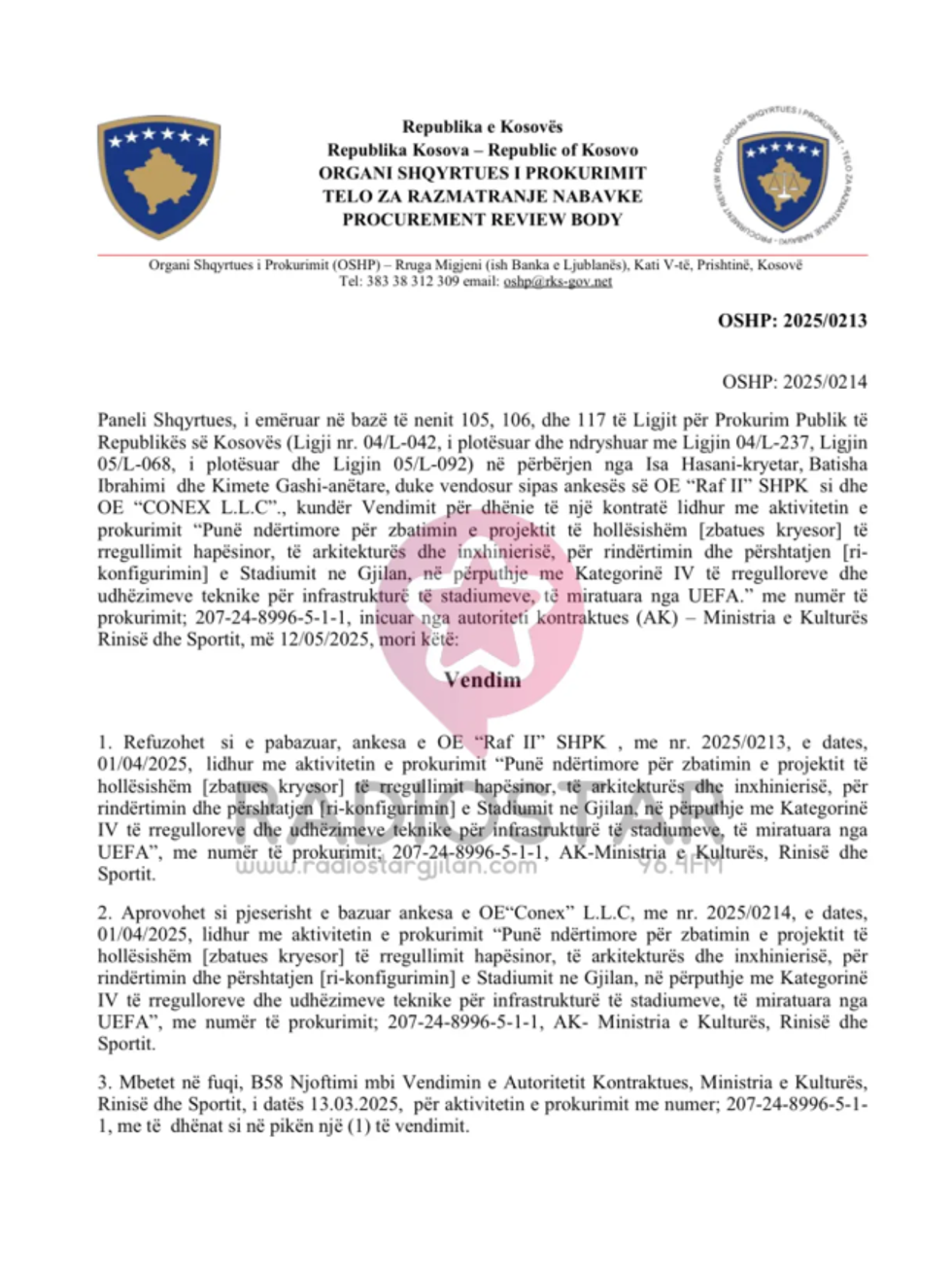 Sipas vendimit të publikuar më 12 maj 2025 nga OSHP, bëhet e ditur se është refuzuar si e pabazuar ankesën e kompanisë “Raf II” SHPK.