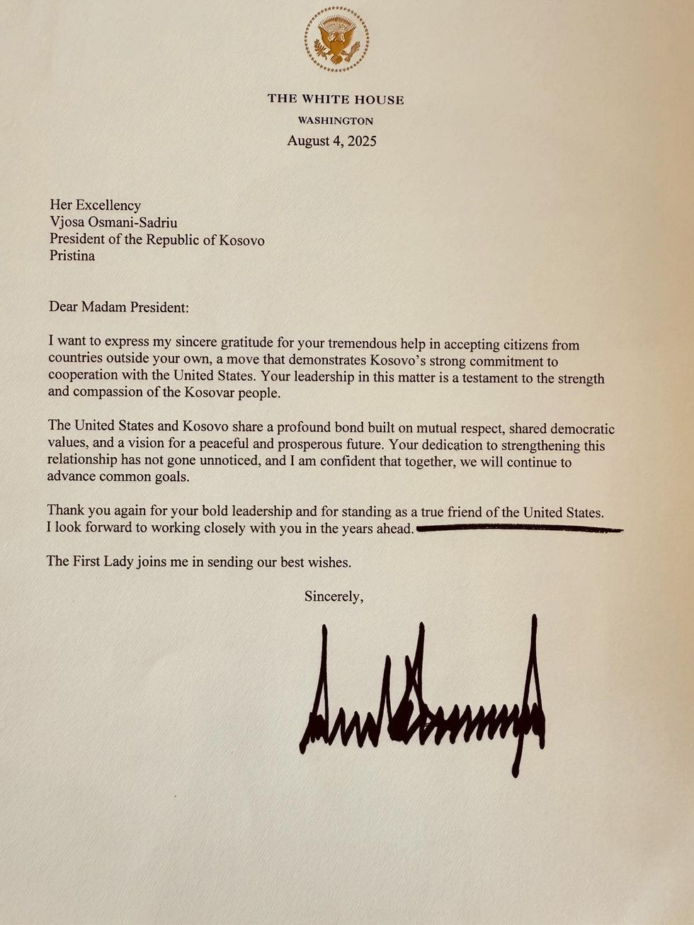 Ndryshe, në letrën e presidentit Trump thuhet se Shtetet e Bashkuara dhe Kosova ndajnë një lidhje të thellë të ndërtuar mbi respektin e ndërsjellë, vlerat e përbashkëta demokratike dhe vizionin për një të ardhme paqësore dhe të begatë.