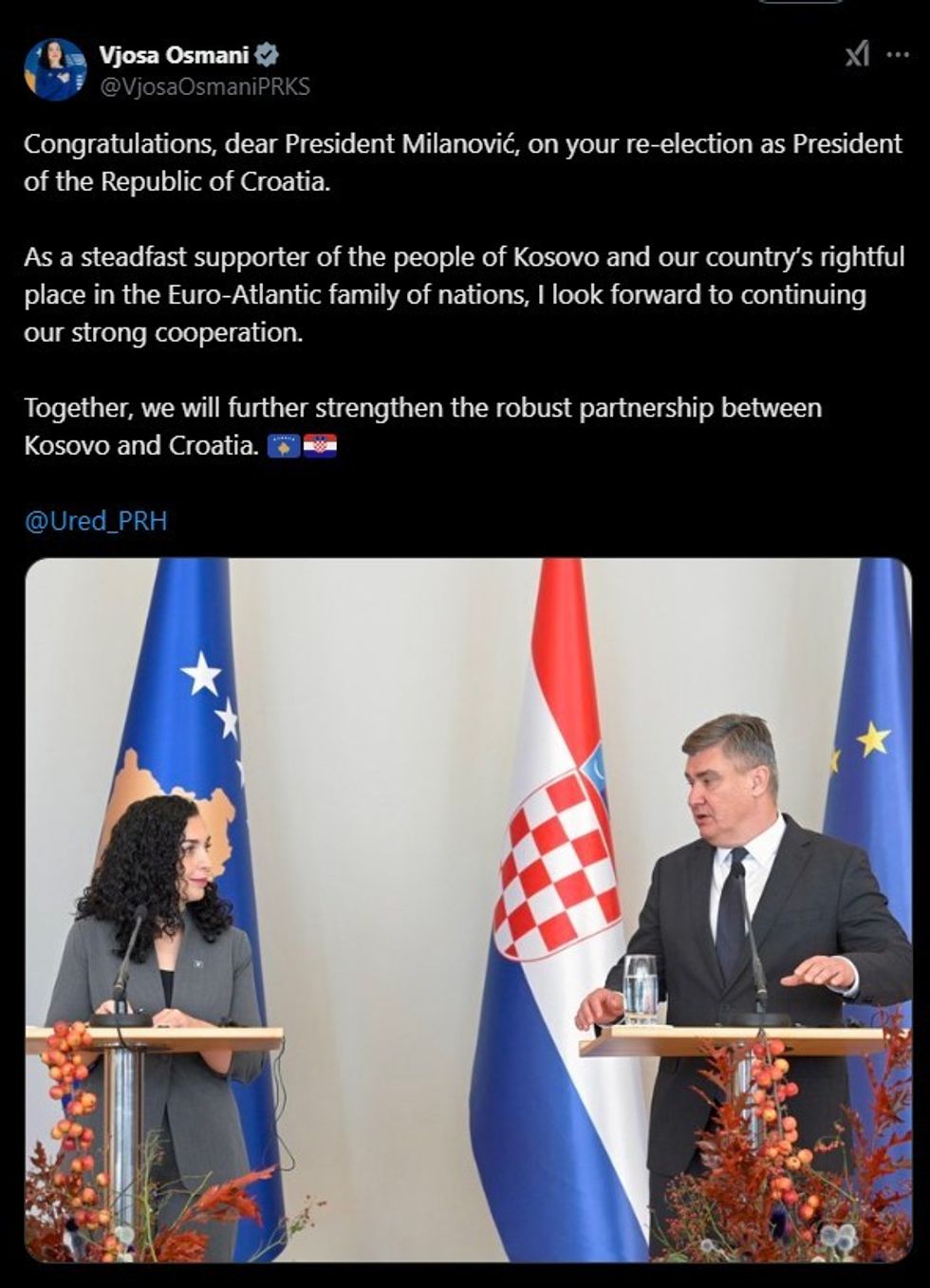 “Urime, i nderuari President Milanoviq, për rizgjedhjen tuaj si President i Republikës së Kroacisë. Si një mbështetës i palëkundur i popullit të Kosovës dhe vendit tonë që i takon familjes euroatlantike të kombeve, pres me padurim vazhdimin e bashkëpunimit tonë të fortë,” shkroi Osmani.