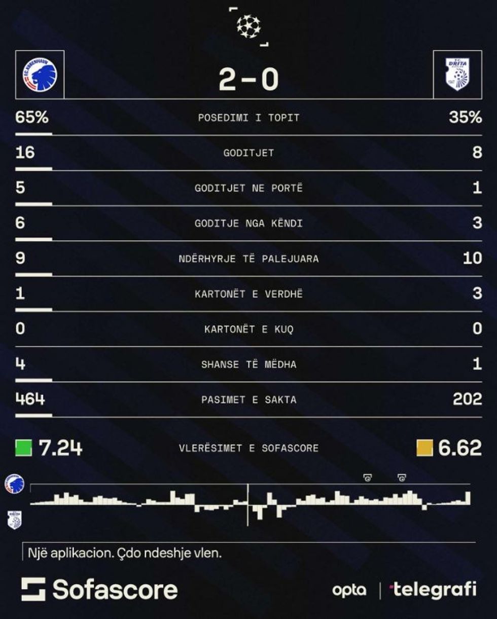 Kampioni i Kosovës e nisi takimin me besim dhe disiplinë taktike, duke u përballur denjësisht me një kundërshtar të kalibrit më të lartë. Edhe pse Copenhagen dominoi në zotërim dhe krijoi më shumë raste, mbrojtja e Dritës rezistoi për më shumë se një orë.