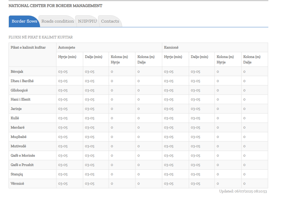 Të dhënat e fundit nga Qendra Kombëtare për Menaxhimin e Kufirit, të publikuara në orën 08:10, tregojnë se në asnjë pikë kufitare nuk ka kolona të automjeteve apo pritje të gjata.