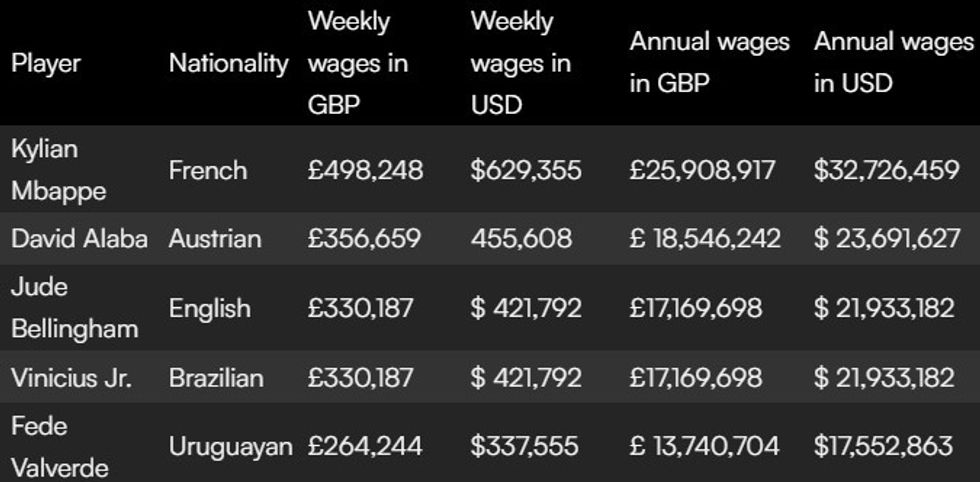 David Alaba përfiton 18 milionë euro, i ndjekur pas nga Jude Bellingham në vendin e tretë dhe Vinicius në të katërtin, që të dy me paga të barabarta.
