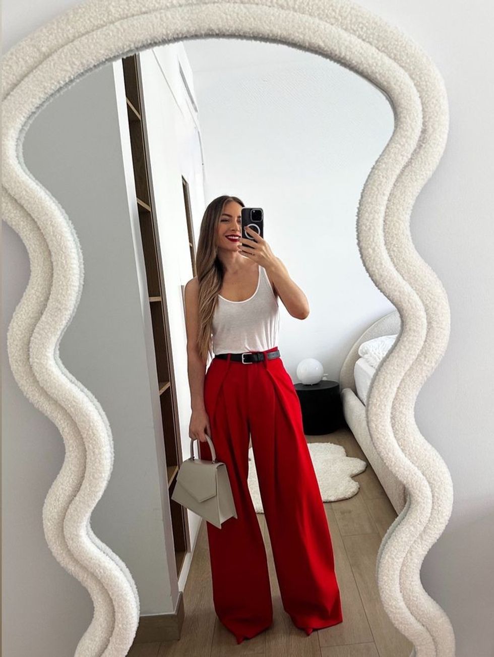 Pantallonat e kuqe të përshtatura mirë me pala dhe këmbë të gjera mund të jenë pjesa kryesore në gardërobën tuaj. Duke qenë se ende na pëlqen kombinimi i relaksimit dhe elegantes dhe na pëlqen të veshim ngjyrën e panxharit me të kuqe, ja një kombinim që mund ta përdorni nga puna në festë. Thjesht zëvendësoni çantën.