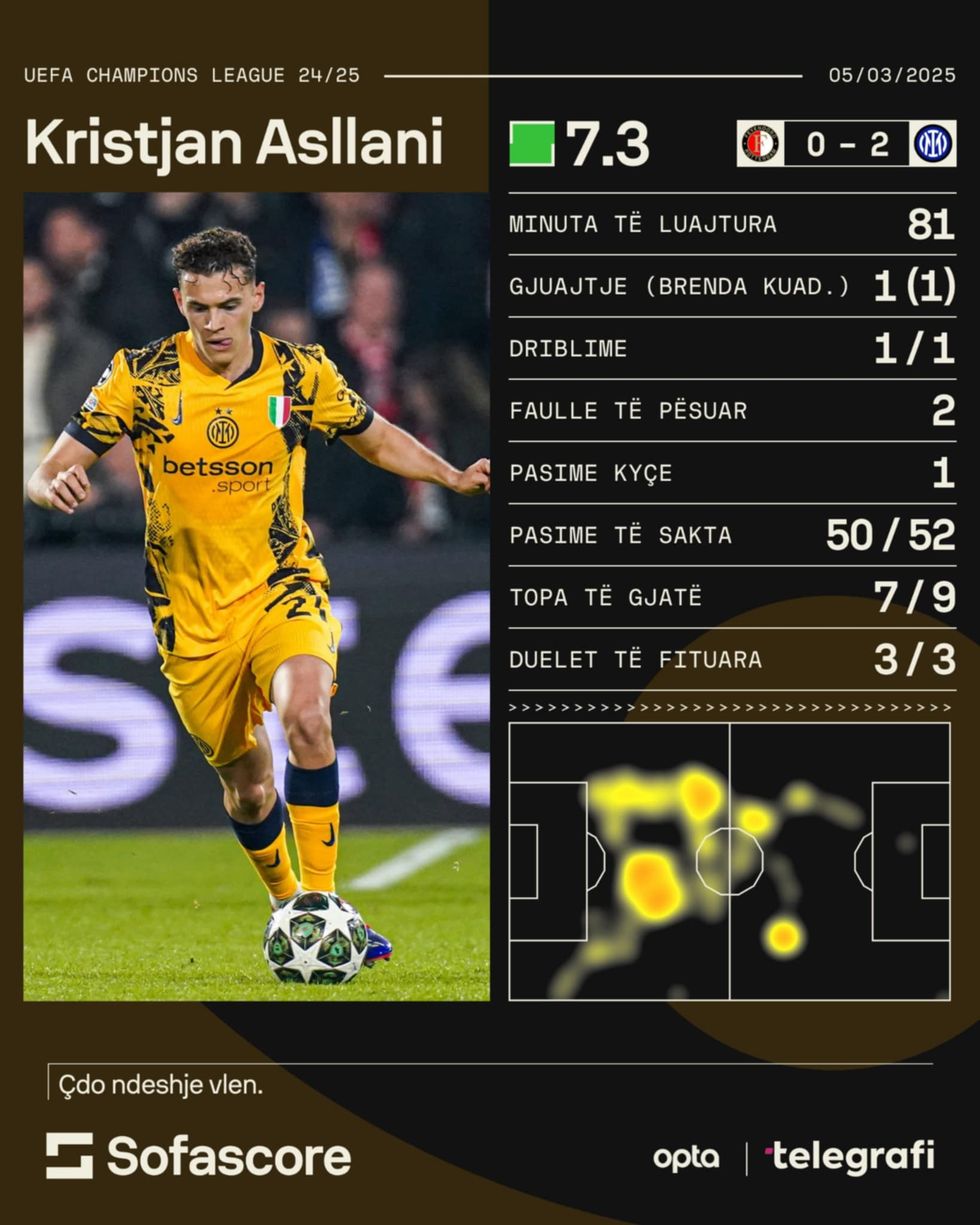 Paraqitja fantastike e Kristjan Asllanit në statistika në fitoren e Interit ndaj Feyenoord