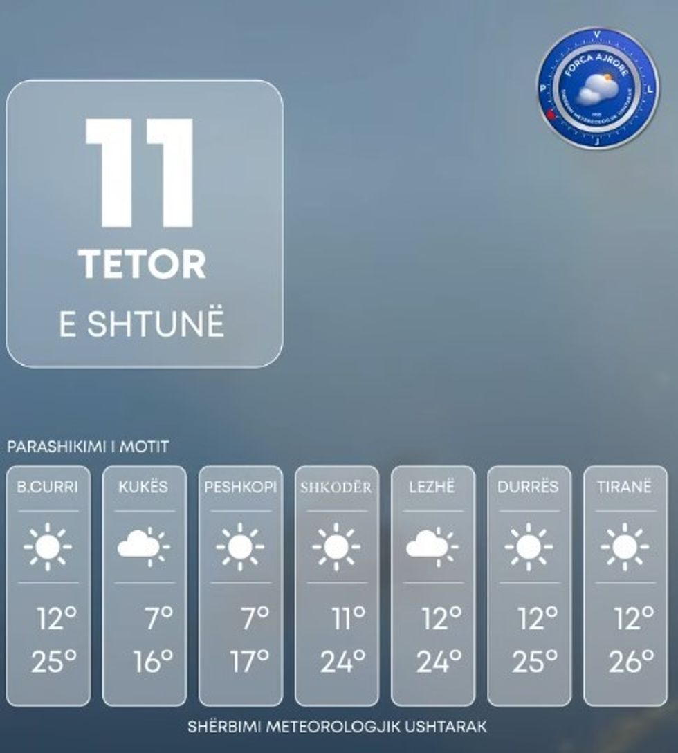 Shërbimi Meteorologjik Ushtarak bën të ditur se moti parashikohet kryesisht i kthjellët.