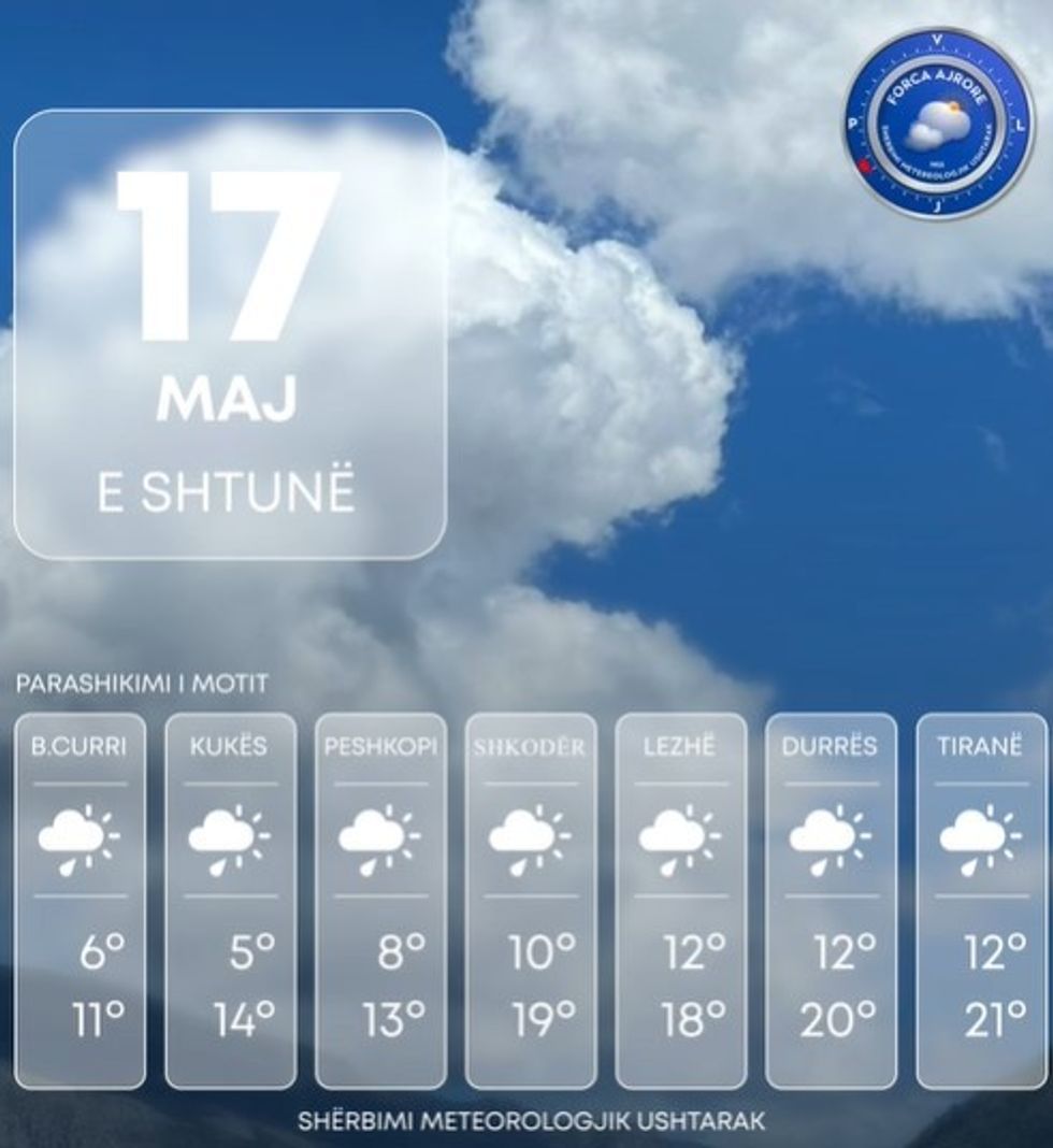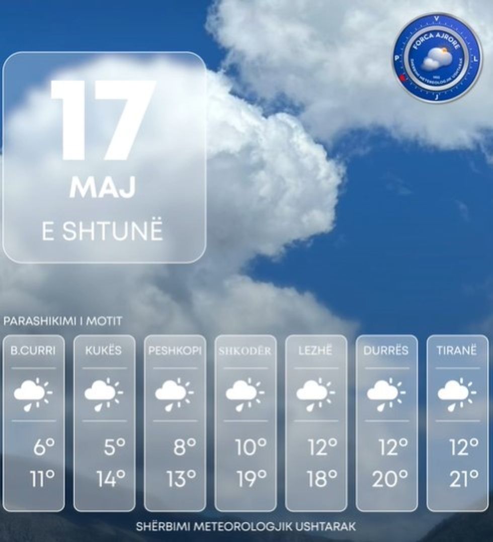 SHMU njofton se mot me kthjellime dhe alternime vranësirash, më të theksuara në relievet kodrinore-malore te vendit, nga ku dhe do të pasohen me reshje lokale shiu me intensitet të ulët gjatë orëve të mesditës e pasdites.