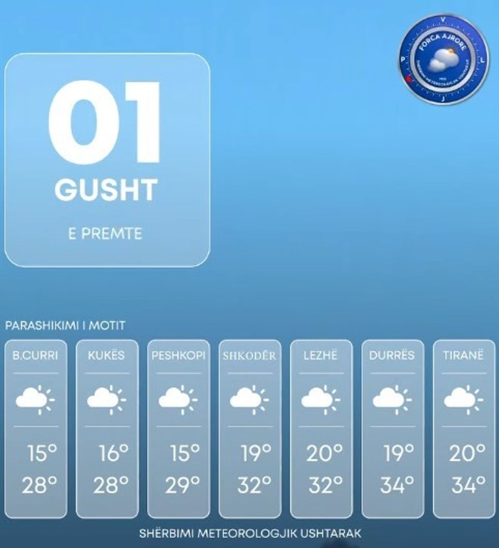 Shërbimi Meteorologjik Ushtarak bën të ditur se moti parashikohet me kthjellime dhe vranësira të pakta kalimtare.