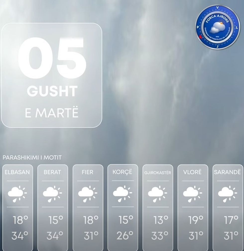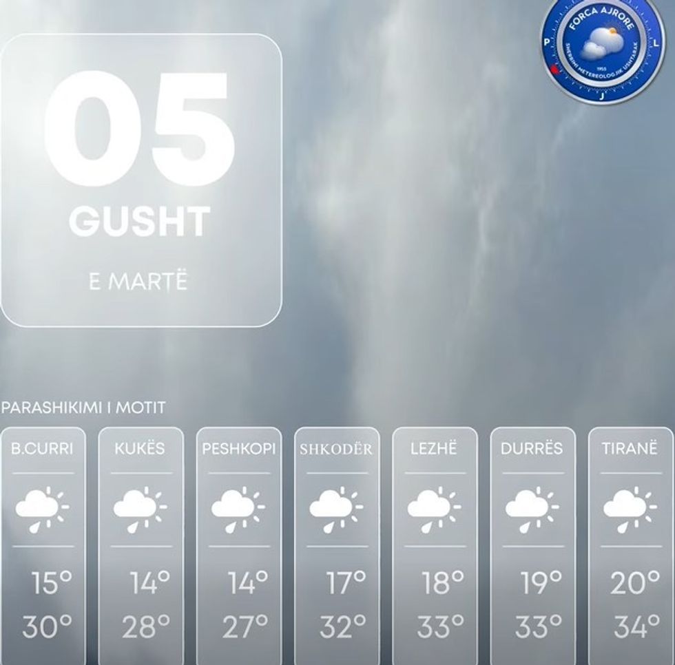Shërbimi Ushtarak Meteorologjik njofton se moti parashikohet fillimisht me kthjellime dhe gradualisht shtim vranësirash mesatare deri të dendura, më të theksuara në relievet kodrinore-malore të vendit.