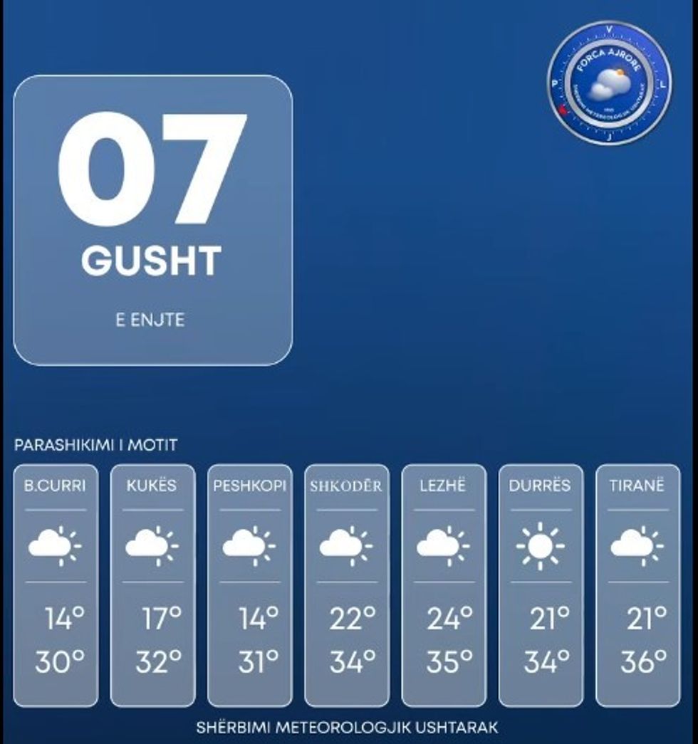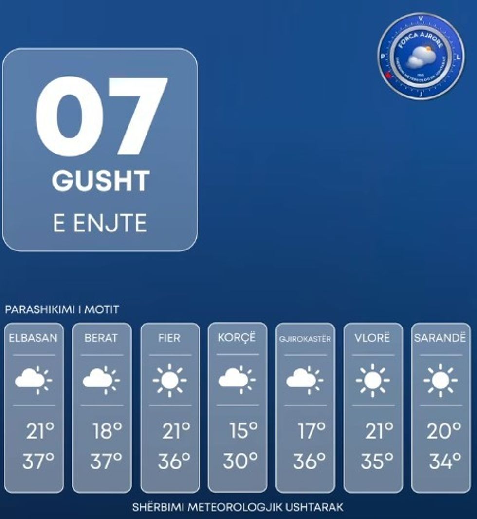 Shërbimi Meteorologjik Ushtarak njofton se moti parashikohet i kthjellët në pjesën më të madhe të territorit përjashtuar vranësirat e pakta deri mesatare kalimtare nga orët e mesditës deri ato të pasdites kryesisht në relievet kodrinore – malore.