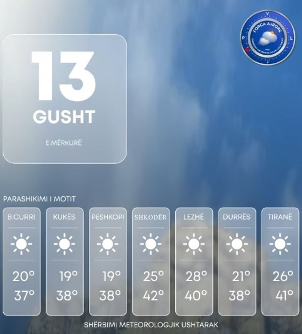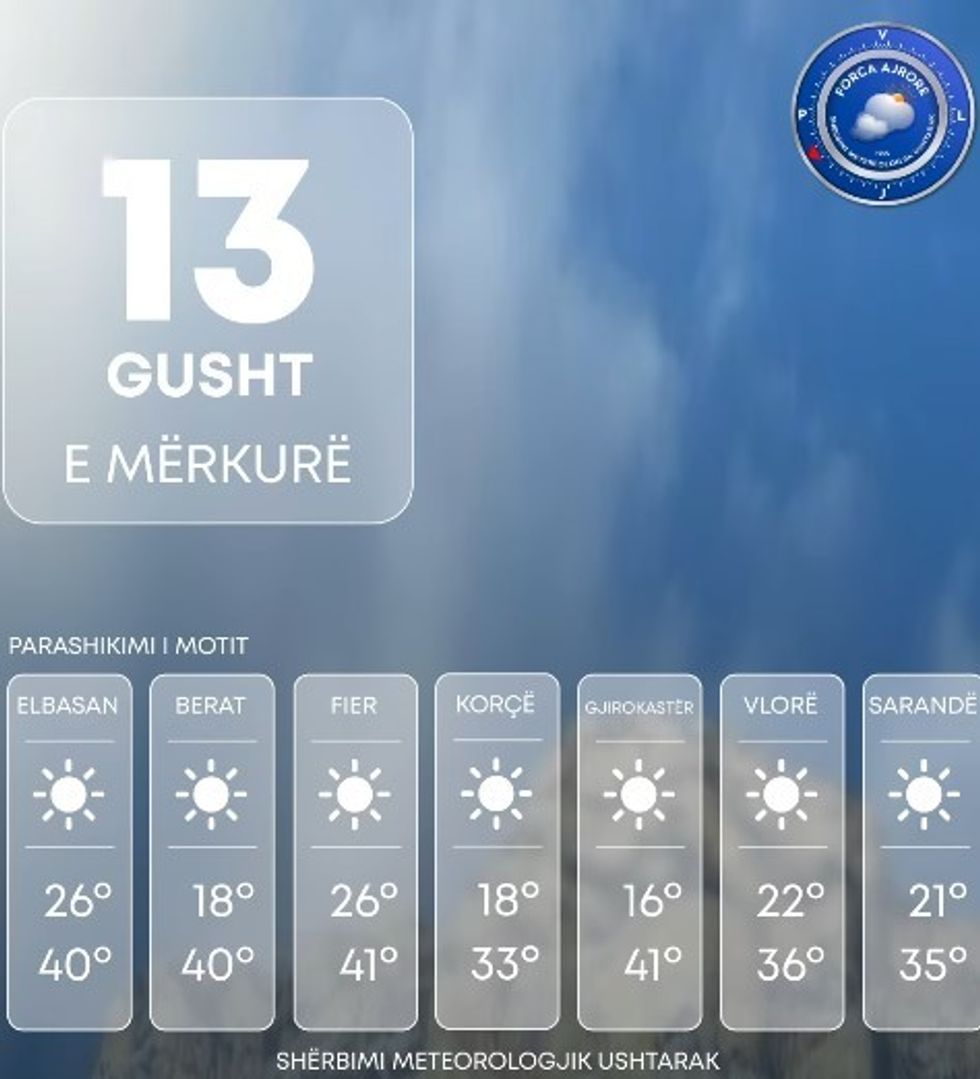 Shërbimi Meteorologjik Ushtarak bën të ditur se të mërkurën Shqipëria do të ndikohet nga kushte atmosferike të qëndrueshme.