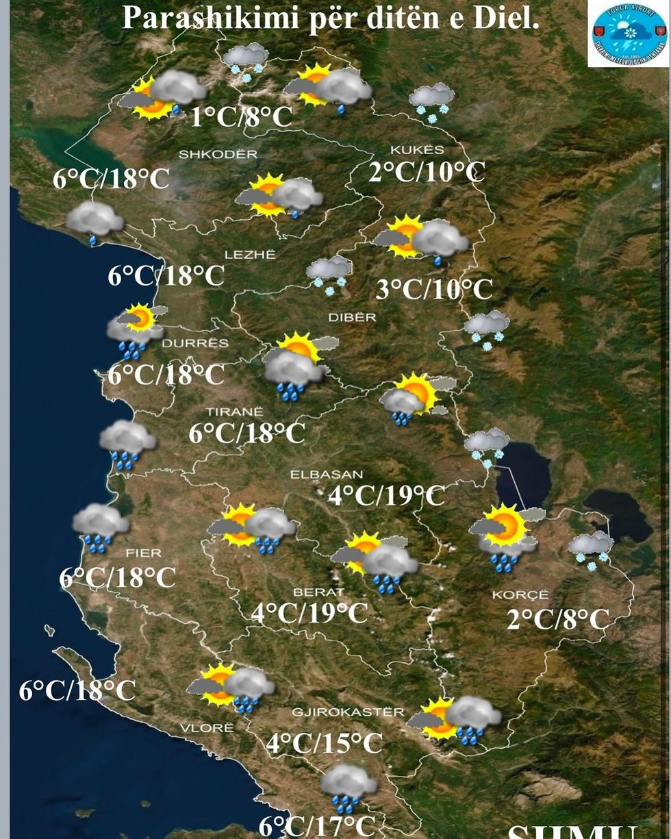 Ndërkaq, për të dielën parashihet që moti të jetë fillimisht me kthjellime, më pas vranësira në shtim të cilat do të pasohen me reshje shiu gjatë orëve të mesditës, duke filluar prej vijës bregdetare e gradualisht në të gjithë territorin.