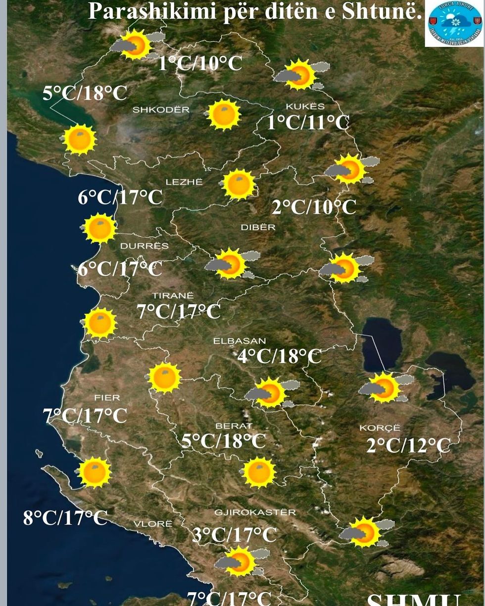 SHMU njofton se temperaturat minimale do të lëvizin ndërmjet 1 dhe 8 gradë Celsius, ndërsa maksimalet ndërmjet 10 dhe 18 gradë.
