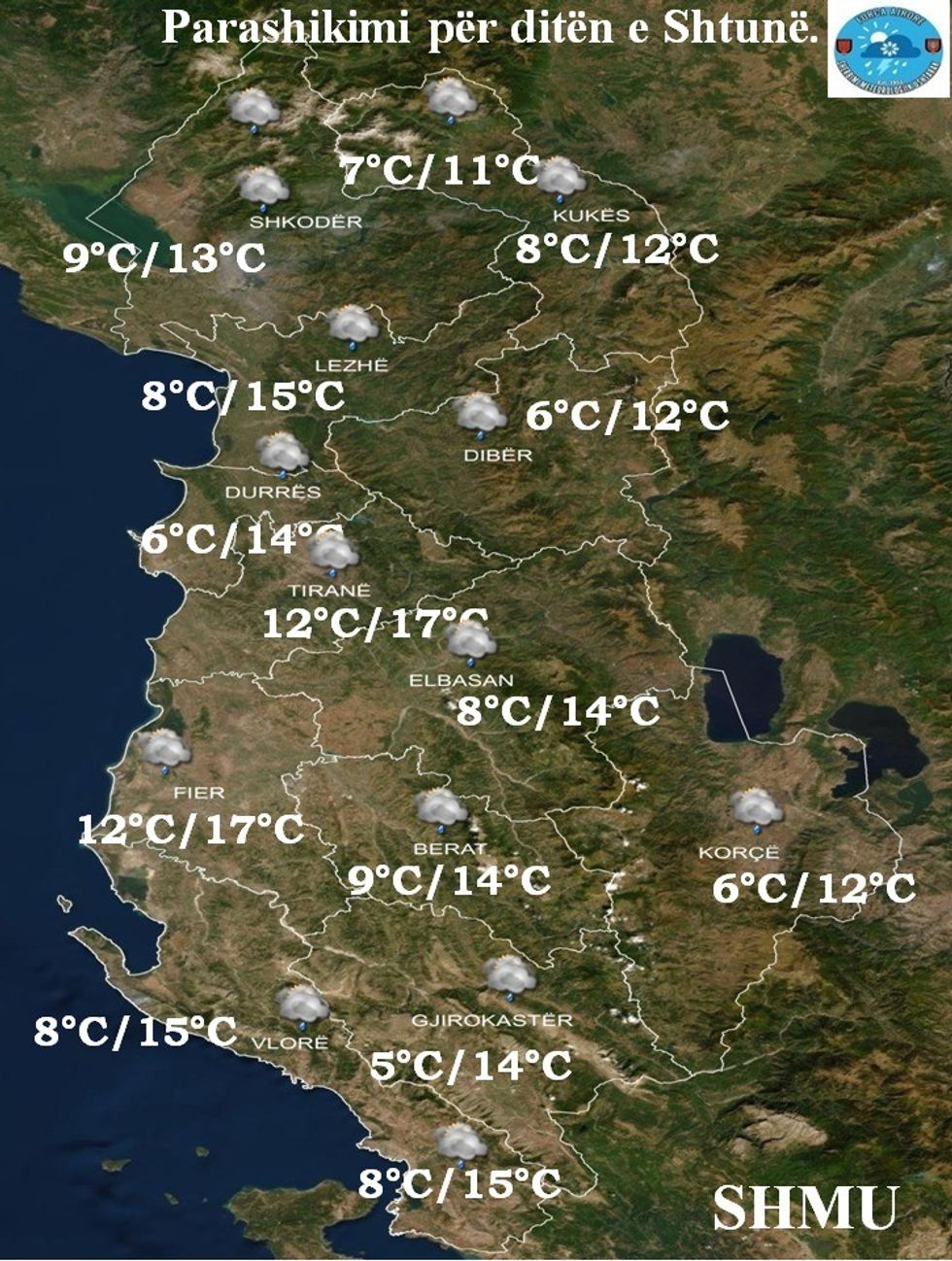 SHMU njofton se të shtunën do të ketë prezencë të reshjeve të herëpashershme të shiut me intensitet të ulët nga orët e mesditës, kryesisht përgjatë vijës bregdetare për tu izoluar më pas në zonën e veriperëndimit.