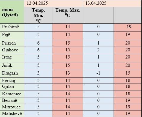 Temperaturat minimale do të bien ndjeshëm, duke lëvizur nga -1 deri në 2 gradë Celsius, ndërsa ato maksimale do të shënojnë rritje dhe pritet të jenë ndërmjet 15 dhe 20 gradë.