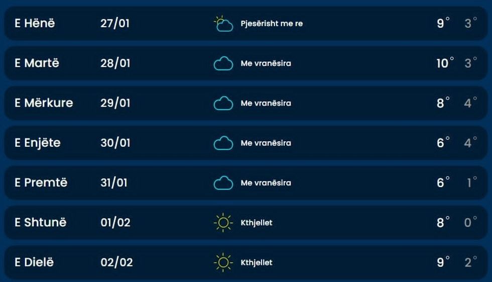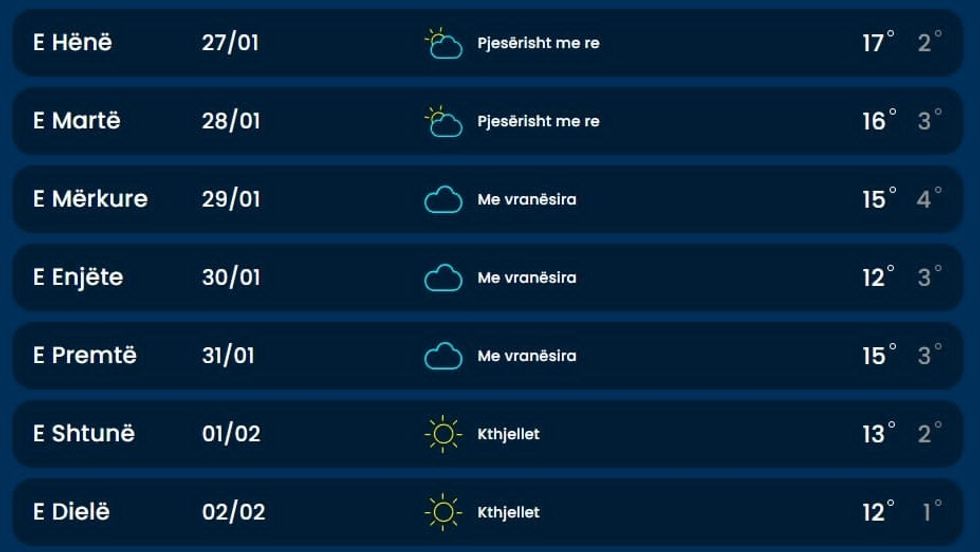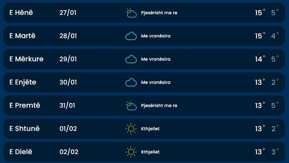 Drejt fundit të javës, moti do të bëhet pjesërisht me re dhe më pas i kthjellët, me temperatura që mbeten të qëndrueshme, nga 13°C maksimalja deri në 2°C minimalja.