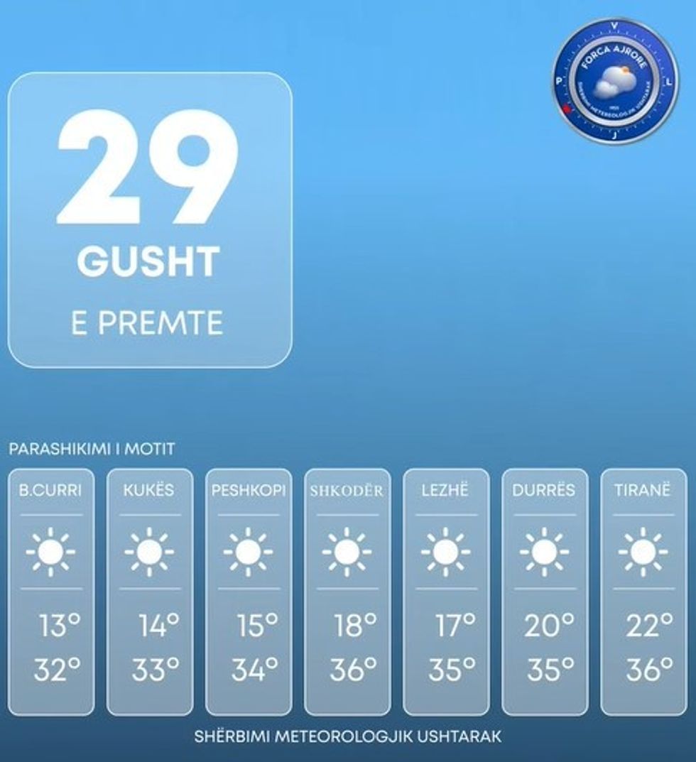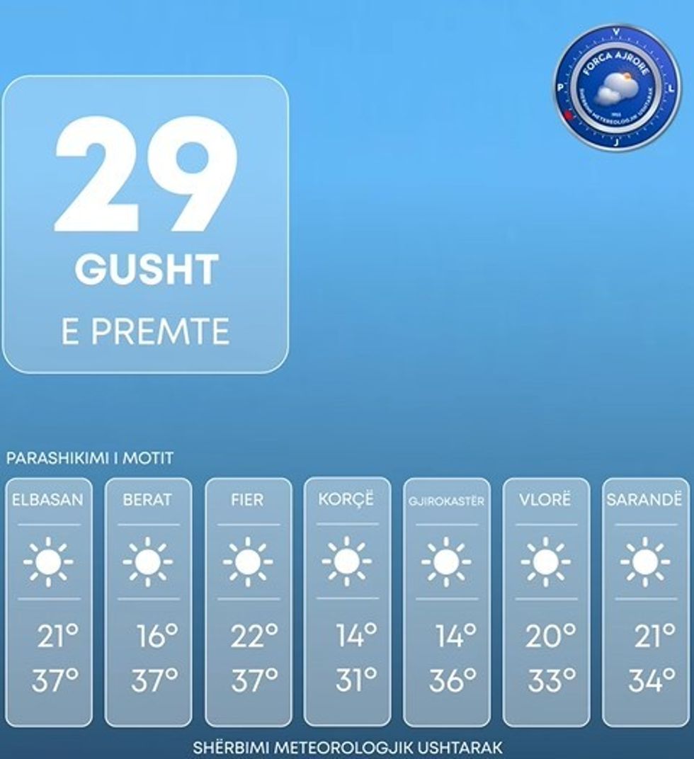Shërbimi Meteorologjik Ushtarak bën të ditur se era do të fryjë me drejtim nga kuadrati i jugut me shpejtësi mesatare 7 m/s, ndërsa në zonat luginore dhe përgjatë vijës bregdetare hera-herës do të fitojë shpejtësi deri në 12 m/s.