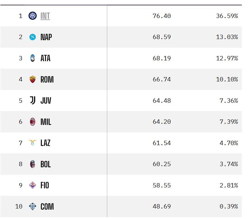 Pas tyre vjen kampioni në fuqi, Napoli me 13.03 për qind shanse, ndërsa Atalanta është menjëherë pas tyre me 12.97 për qind.