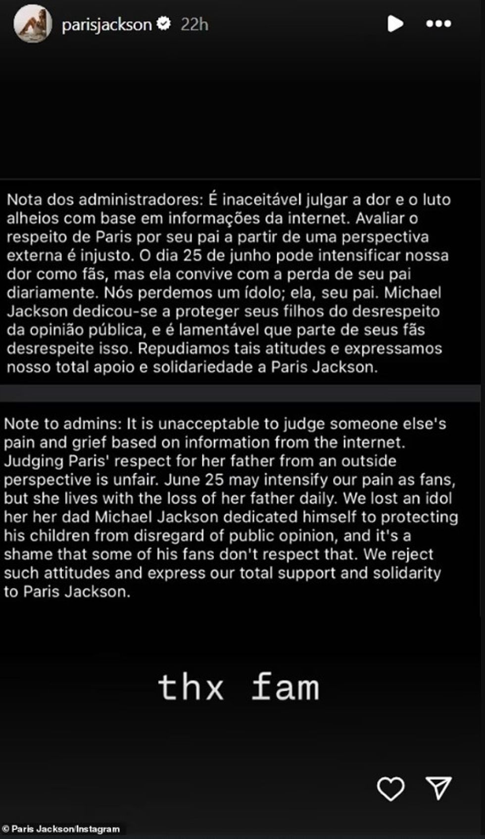 Paris nënvizoi se dhimbja për humbjen e të atit nuk kufizohet në një datë të vetme dhe se nuk duhet gjykuar për mënyrën se si e përballon.