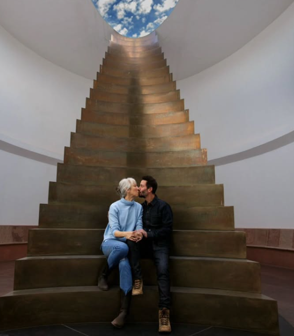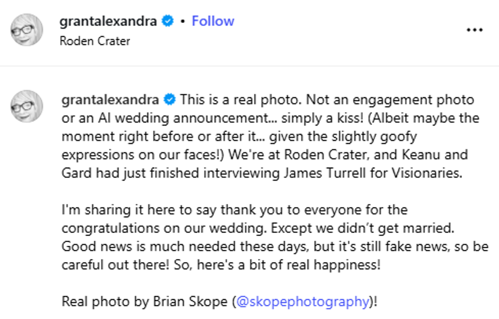 "Kjo është një foto e vërtetë. Jo një foto fejese apo një njoftim martese me anë të inteligjencës artificiale… vetëm një puthje! (Megjithëse ndoshta një moment pak para ose pas… duke pasur parasysh shprehjet paksa qesharake në fytyrat tona!) Jemi në Kraterin Roden dhe Keanu dhe Gard sapo përfunduan intervistën e James Turrell për Visionaries", shkroi Alexandra pranë fotos, duke iu referuar serialit të Keanu-së në “Roku Channel”.