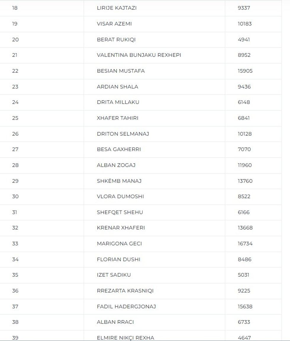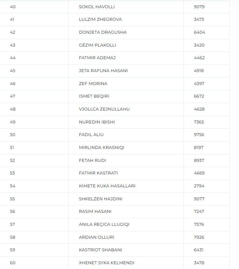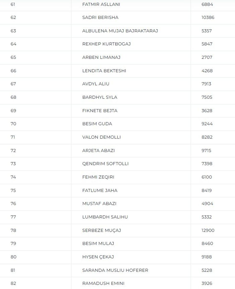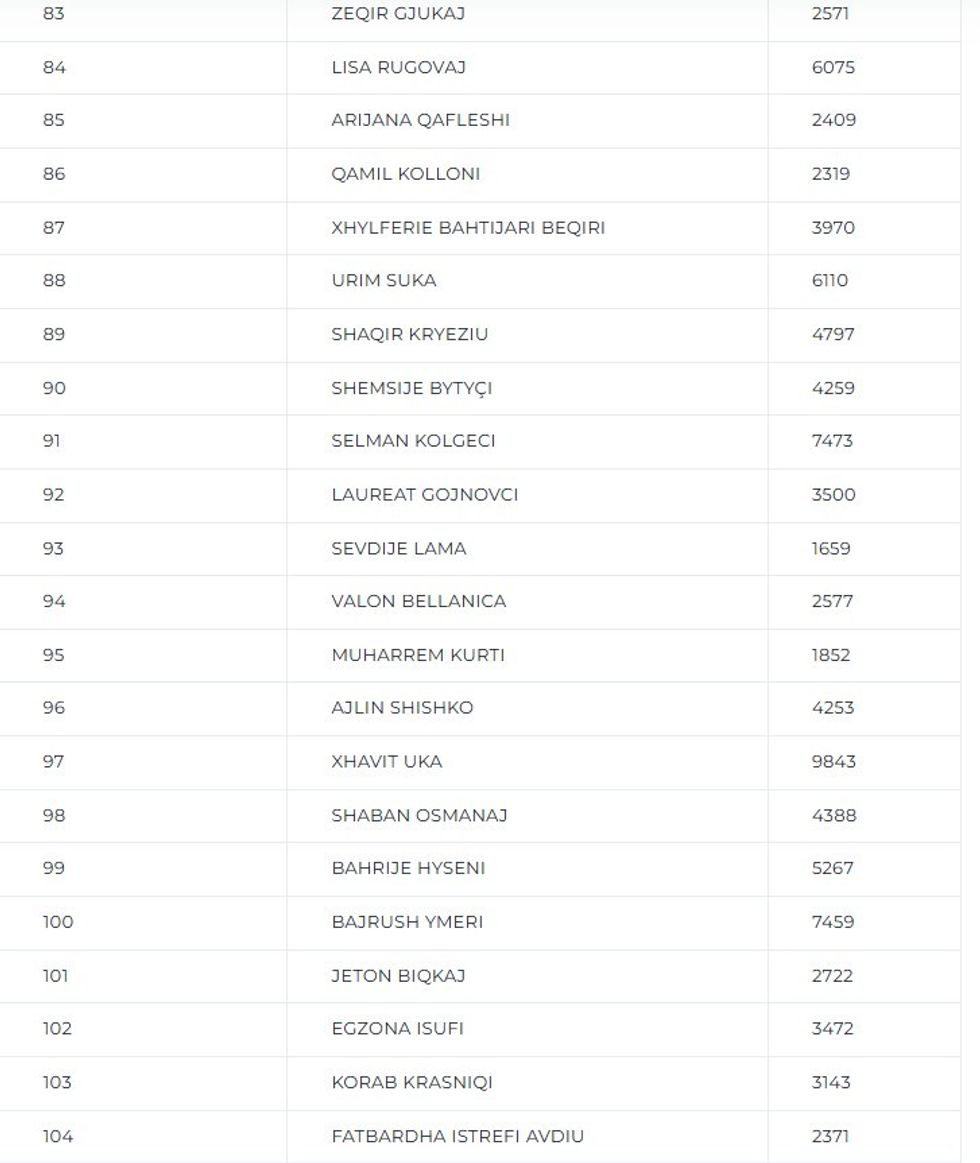 I katërti për nga numri i votave është Kujtim Shala me 37,886 vota, Avdullah Hoti me 30,932 vota, Anton Quni me 27,292 dhe Lutfi Haziri me 27,260 vota.