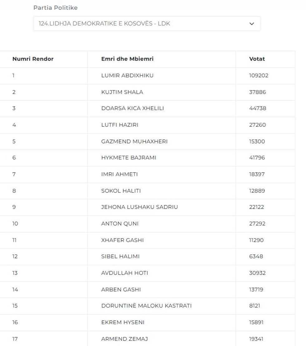 Në listën e Lidhjes Demokratike të Kosovës prin me vota kryetari i kësaj partie, Lumir Abdixhiku me 109202 vota, më pas vjen Doarsa Kica Xhelili me 44,738 vota, Hykmete Bajrami me 41,79.