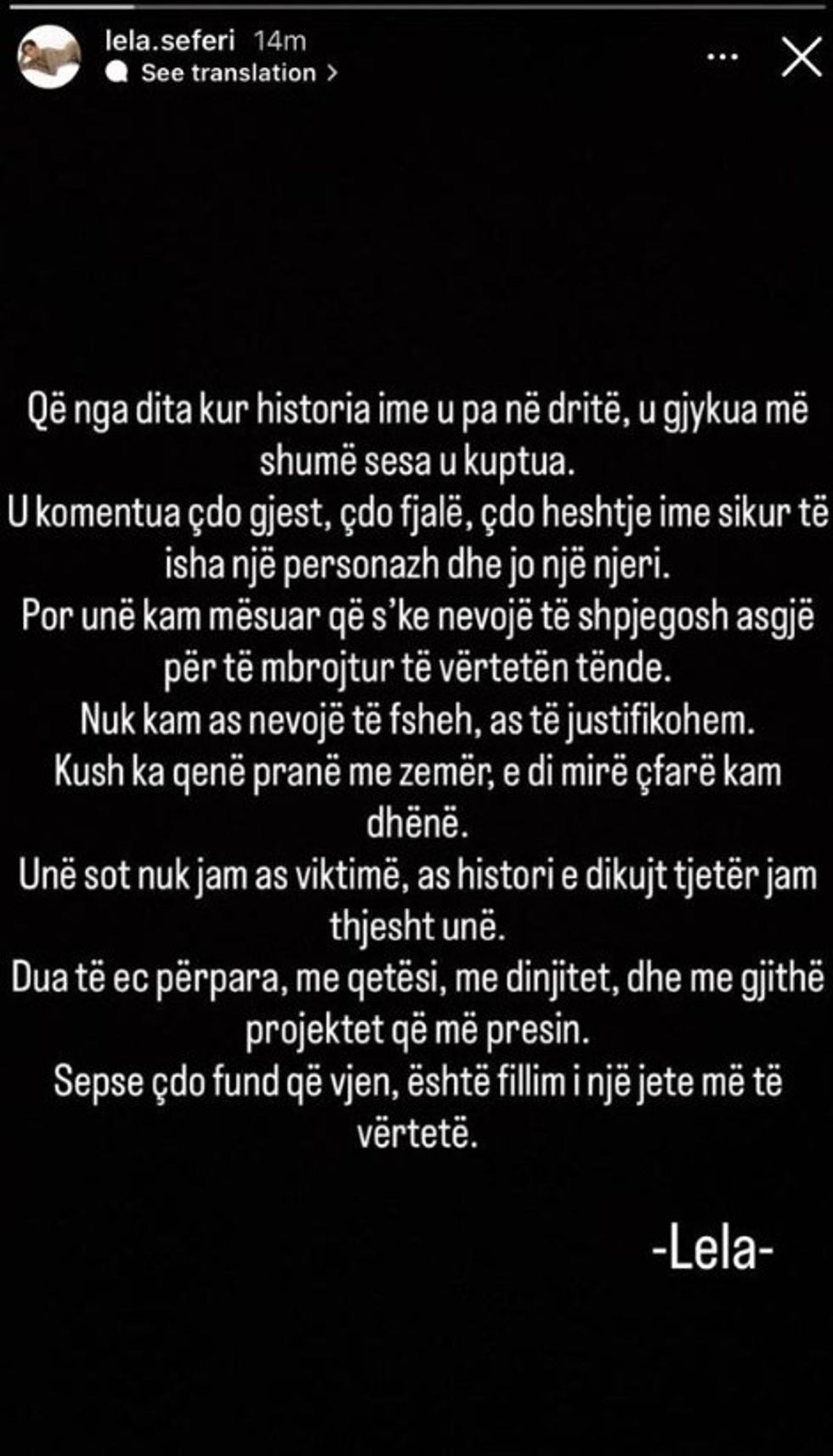 Në të njëjtin mesazh, Lela theksonte se nuk e sheh veten si viktimë, por si një grua që zgjedh dinjitetin dhe forcën për të ecur përpara.