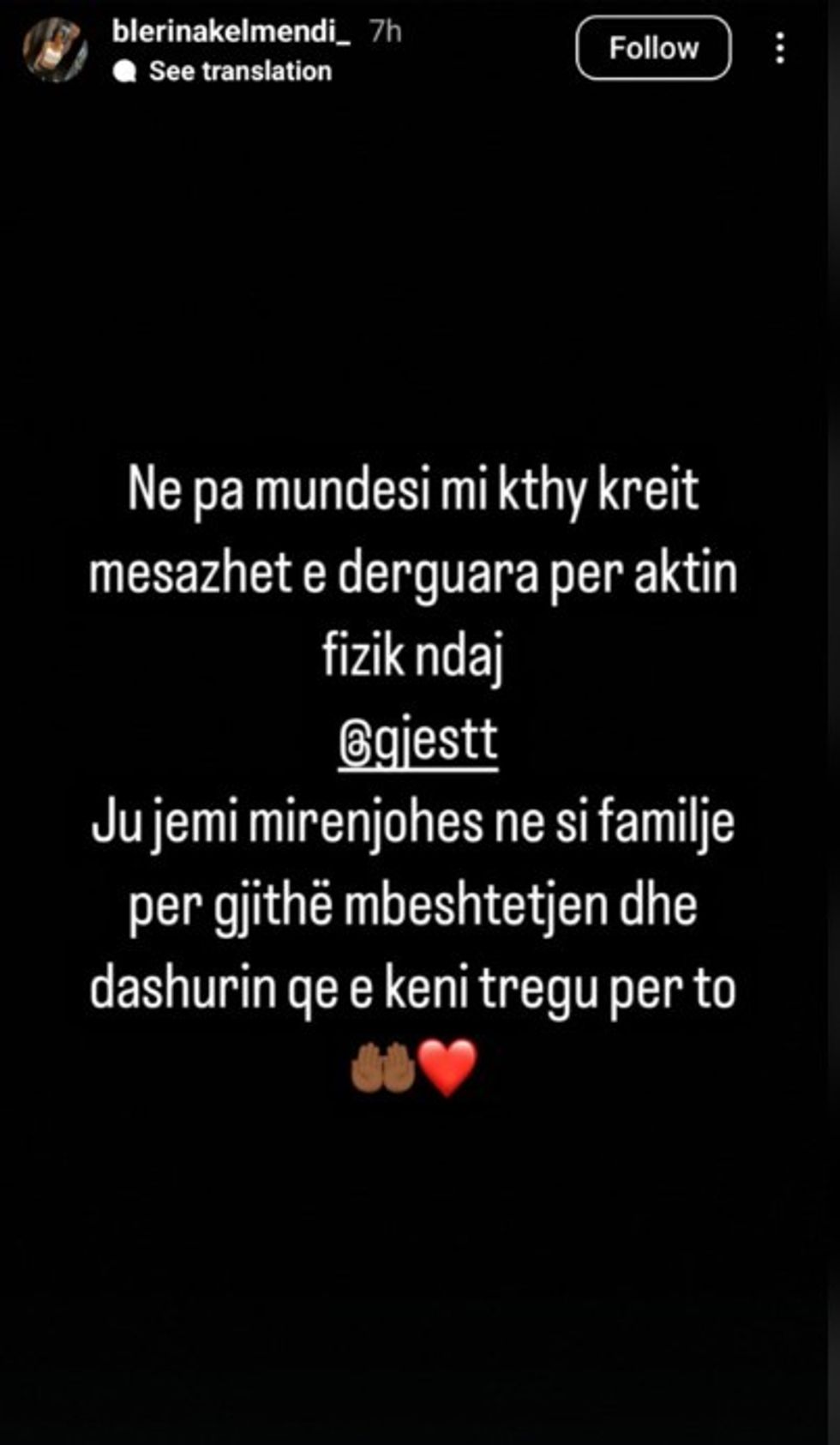 “Në pamundësi për t’i kthyer të gjitha mesazhet, për aktin fizik ndaj Gjestit, ju jemi mirënjohës ne si familje për gjithë mbështetjen dhe dashurinë që e keni treguar për të” – shkruan ajo në InstaStory.