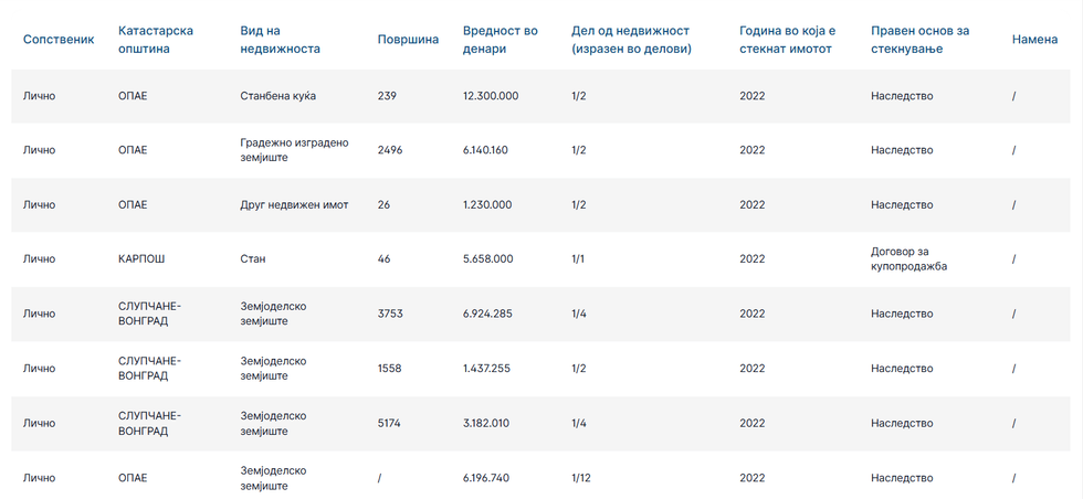 Fetai në Maqedoninë e Veriut ka deklaruar katër toka bujqësore, prej tyre tri në Sllupçan dhe një në Opajë, me hapsirë dhe vlerë të ndryshme monetare, si dhe një tokë ndërtimore në Opajë me hapësirë prej 2496 m2, në vlerë prej 6.140.160 denarëve (99804 euro).