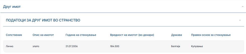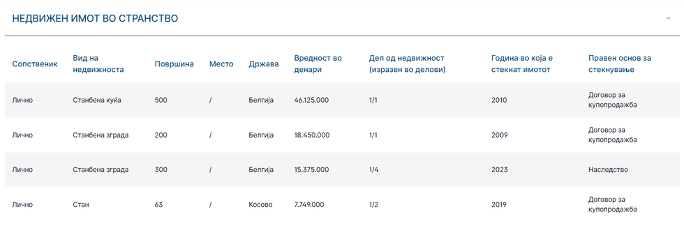 Dy objekte banesore në Belgjikë, një shtëpi banimi në Belgjikë me hapsirë prej 500 m2, në vlerë prej 46.125.000 denarëve (749735 euro) dhe një banesë në Kosovë, me hapësirë prej 63 m2 në vlerë prej 7.749.000 denarëve (125955 euro).
