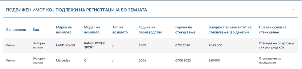 Në RMV ai posedon veturë Land Rover – Range Rover Sport – prodhim i vitit 2009, blerë në vitin 2020 me vlerë prej 1.045.500 denarëve (16994 euro) , si dhe Mercedes C Class të vitit 2004, blerë në vitin 2023, në vlerë prej 369.000 denarëve (5997 euro).