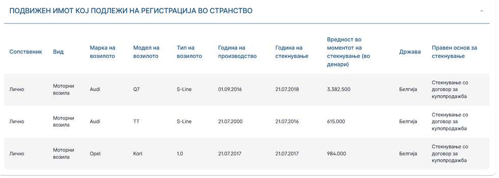 Pasuri të luajtshme, Fetai ka regjistruar në Maqedoninë e Veriut dhe në Belgjikë.