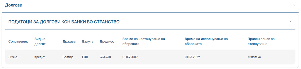 Fetai ka paraqitur poshtu edhe një kredi në Belgjikë në vlerë prej 334.601 euro marrë më 1 mars të vitit 2009 e afatizuar për kthim deri më 1 mars 2029, gjësende ari në vlerë prej 184.500 denarëve (2998 euro) siguruar në Belgjikë. /Telegrafi/