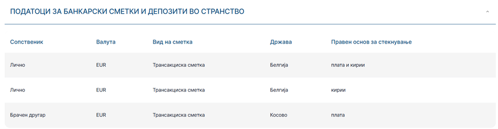 Jashtë shtetit, Fetai ka deklaruar dy xhirollogari bankare në Belgjikë, për pagë dhe qira si dhe një në xhirollogari bankare për pagë në Kosovë në emër të bashkëshortes.