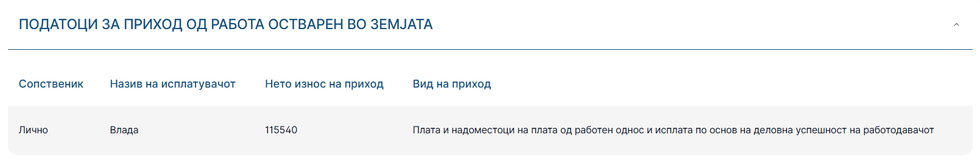 Fetai ka deklaruar një kartelë bankare në RMV për pagën e tij. Sipas deklaratës, ai paguhet nga qeveria 115540 denarë (1878 euro).