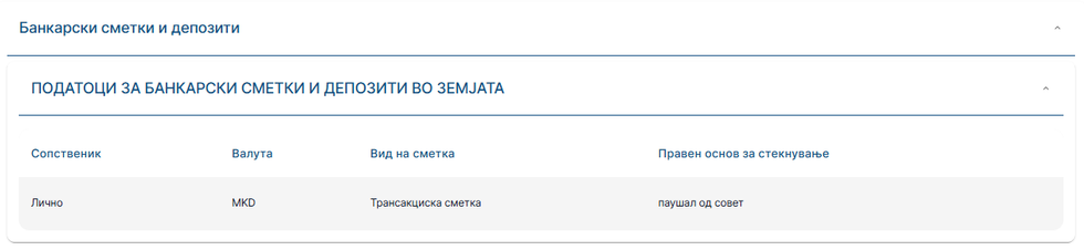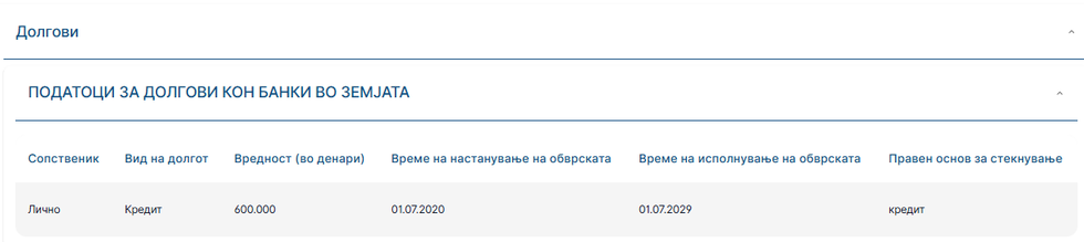Ka një xhirollogari bankare transaksionale për pagesa si dhe një kredi prej 600 mijë denarëve që e ka nënshkruar më 1 korrik 2020 me afatizim pagese deri më 1 korrik 2029. /Telegrafi/