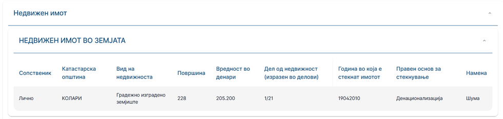 Një pronë – tokë ndërtimore në fshatin Kollare, më hapësirë prej 228 m2, me vlerë prej 205.200 denarëve (3334 euro), regjistruar si pronë në emër të tij nga muaji prill i vitit 2010.