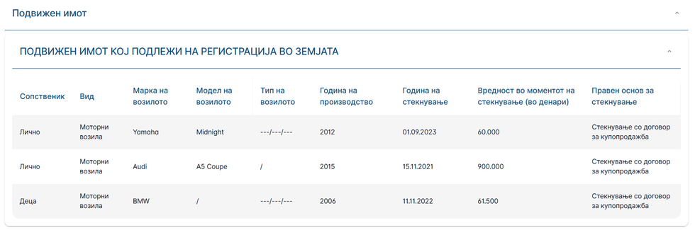 Një veturë Yamaha Midnight prodhim i vitit 2012, blerë në shtator të vitit 2023, me vlerë monetare prej 60.000 denarëve (975 euro).