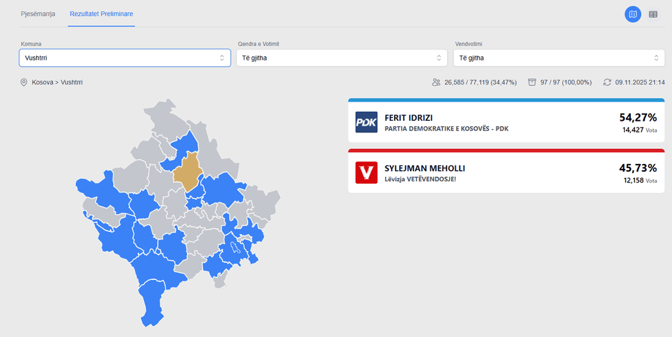 Partia Demokratike e Kosovës (PDK) ka dalë fituese në zgjedhjet komunale në Vushtrri, sipas rezultateve preliminare të Komisionit Qendror të Zgjedhjeve (KQZ).