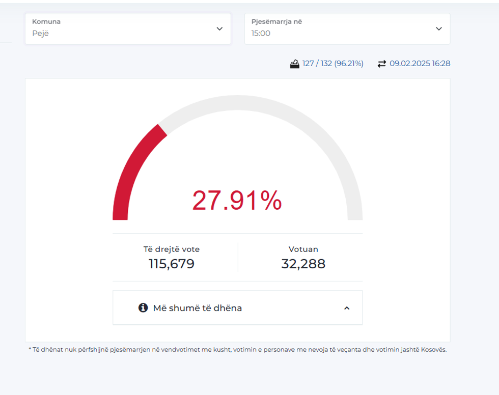 Deri në ora 15:00 në qytetin e Pejës kanë votuar 32 mijë e 288 qytetarë, ndërsa të drejtë vote kanë 115 mijë e 679 qytetarë.
