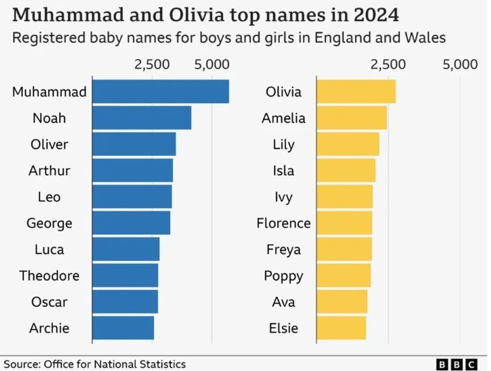 Janë bërë publike emrat që më së shumti janë shfrytëzuar për të pagëzuar fëmijët e lindur në Angli dhe Uells - Muhammad është emri më i popullarizuar mashkull për vitin e dytë radhazi, ndërsa Noah dhe Oliver kanë zënë vendet e dyta dhe të treta, po ashtu si në vitin 2023.