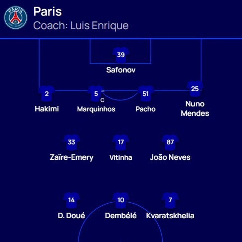 PSG: Safonov, Hakimi, Marquinhos, Pacho, Mendy, Neves, Vitinha, Zaire-Emery, Doue, Dembele, Kvaratskhelia.