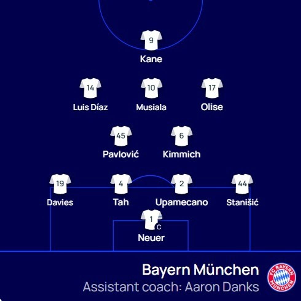 Bayern Munich: Neuer, Stanisic, Upamecano, Tah, Davies, Kimmich, Pavlovic, Olise, Musiala, Diaz, Kane.