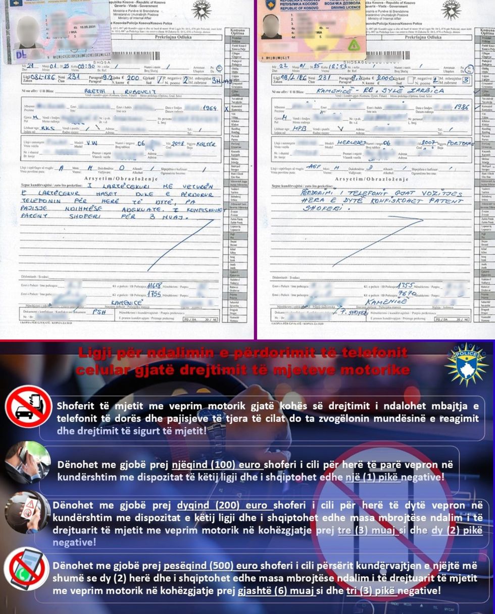 Policia e Kosovës në Kamenicë, ka bërë të ditur se gjatë patrullimit kanë hasur në dy kundërvajtës në dy raste të ndara të cilët gjatë drejtimit të mjeteve kanë përdorur telefonin mobil në kundërshtim me ligjin për rregullat në trafikun rrugor.