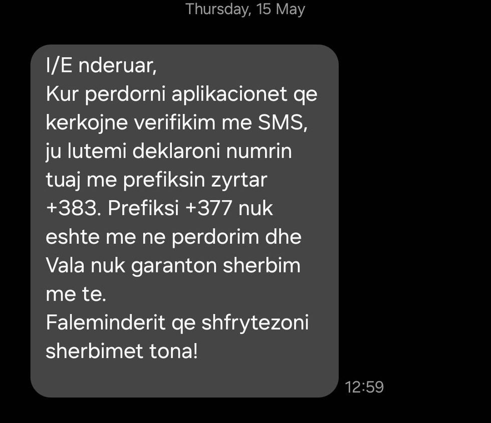 Vala ka dërguar sms tek përdoruesit e saj për këtë njoftim të rëndësishëm: “I/e nderuar, kur përdorni aplikacionet që kërkojnë verifikim me SMS, ju lutem deklaroni numrin tuaj me prefiksin zyrtar +383. Prefiksi +377 nuk është më në përdorim dhe Vala nuk garanton shërbim me të. Faleminderit që shfrytëzoni shërbimet tonë”, thuhet në sms e Vala-s.