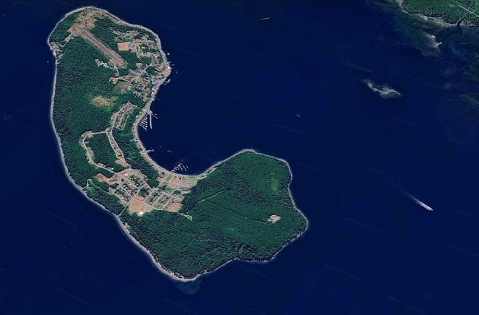 Formacioni i çuditshëm si kafkë mund të gjendet në Google Maps duke kërkuar për fshatin Alert Bay, vendbanimi i vetëm i ishullit.