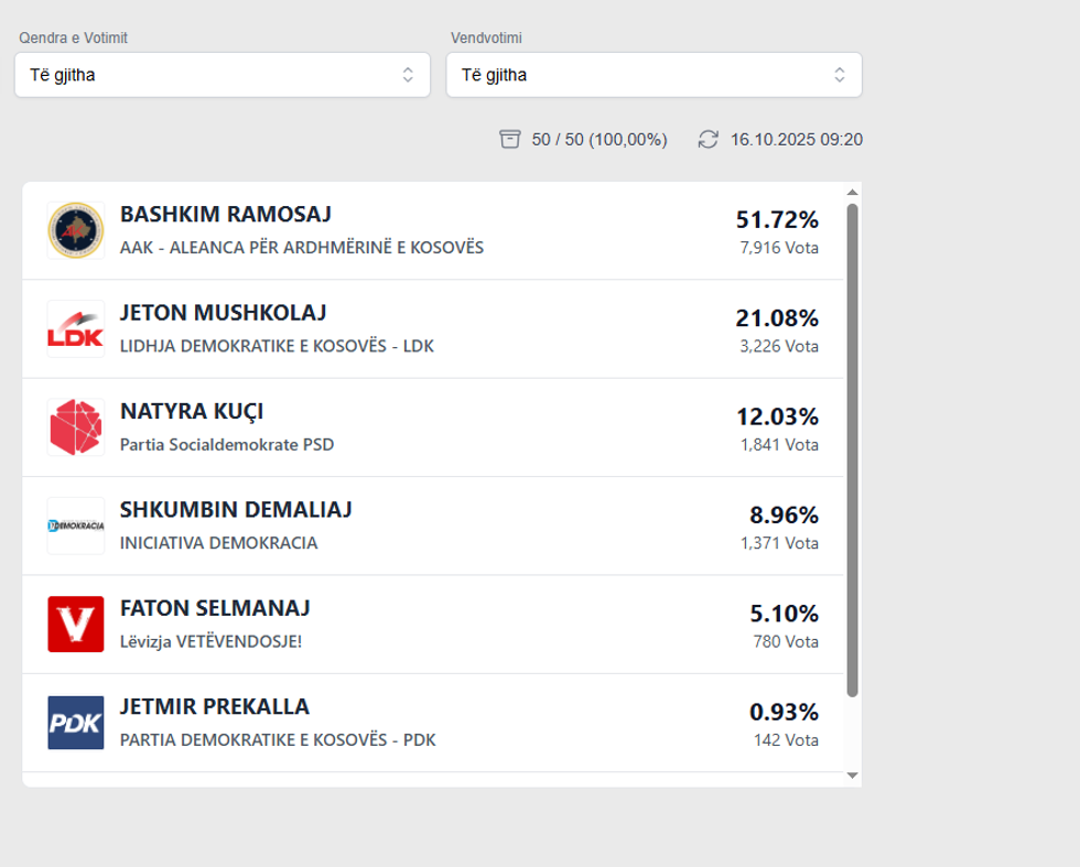 Ai ka marrë 51.72% të votave, ndërsa Jeton Mushkolaj nga LDK ka marrë 21.08%.