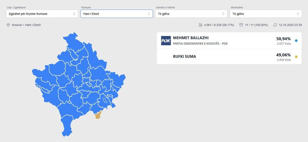 Në zgjedhjet për Kryetar Komune në Hani i Elezit, Mehmet Ballazhi nga Partia Demokratike e Kosovës (PDK) ka fituar me një rezultat të ngushtë.